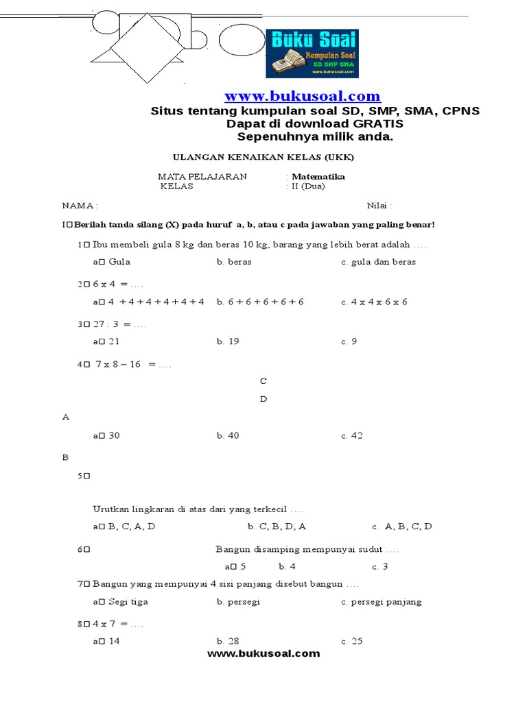 Soal ukk kelas 3 sd lainnya : Soal ukk matematika kelas 3 sd. Contoh soal uas/pas/ukk kelas 1 sd ini dibuat sesuai dengan kemampuan anak didik kelas 1 sd. Soal ukk plh kelas 3. Soal ukk ipa kelas 3 sd terbaru | kumpulansoalulangan.c om akan melanjutkan mengenai soal soal ukk kelas 3 sd. Soal ukk matematika kelas 3 sd. Berhubungan ulangan kenaikan kelas akan diadakan sebentar lagi, kami akan membagikan soal ukk bahasa inggris untuk siswa sd kelas 1, 2, 3, 4. Berikut ada beberapa contoh soal ukk bahasa indonesia kelas 3, silahkan dipelajari ya. Soal kelas 3 sd semester 1 dan semester 2. Ulangan kenaikan kelas (ukk) atau penilaian kenaikan kelas (pkk) atau penilaian akhir tahun (pat) merupakan kegiatan yang dilakukan oleh pendidik di akhir semester genap untuk mengukur pencapaian kompetensi peserta didik di akhir. Setelah peserta didik melakukan kegiatan belajar mengajar selama satu tahun maka akan dilakukan ujian. Berikut ini kami akan membagikan bank soal ukk, untuk sd/mi tingkat kelas 1, 2, 3, 4, 5 tahun anutan 2020 2020 lengkap terdiri dari semua mata pelajaran pokok, sehingga bagi bapak ibu guru di sekolah yang sedang memerlukan materi latihan soal ujian kenaikan kelas sanggup memanfaatkan. Documents similar to soal ukk matematika kelas 3 sd.